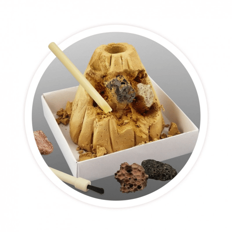 Reproduceer een vulkaanuitbarsting met behulp van de meegeleverde reagentia . Gebruik de gereedschappen om in de vulkaan te graven en 5 vulkanische rotsen op te graven.
