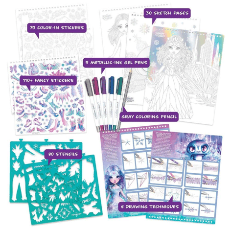 Laat je creaties schitteren als zilveren sterren! Het klassieke modeschetsboek is verfraaid met metallic gelpennen en metallic folieachtergronden. Ontdek Iceana en haar ijzige stijl via een heleboel creatieve activiteiten.